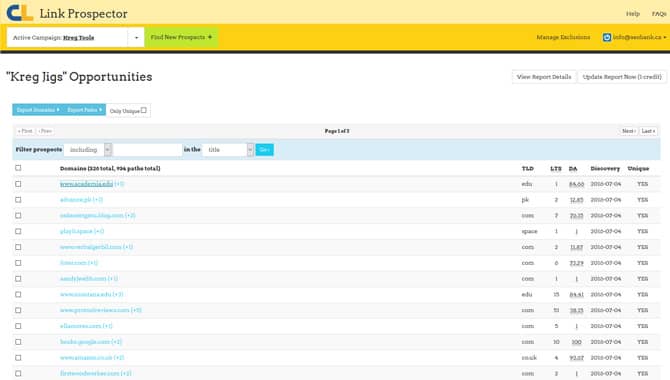 With Link Prospector, you just have to enter the key phrases and types of link sources you are looking to build and link prospector will find thousands of results from higher authority websites within a few minutes. After this, you just have to single out your preferred or top prospects and export them easily to CSV.