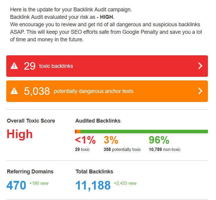 Notice it is warning the business owners of a potential Google Penalty? It also states in a very real way, “avoid a lot of time and money wasted” in the future by not buying and sending in toxic links with no thought put into the anchor text or running a clean backlinking profile.