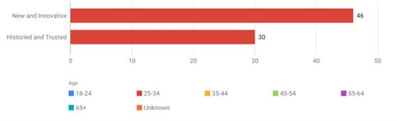 However, to meet our survey’s objectives, we needed to ask people in America a critical question: “Would you be more interested in working with a new, innovative company or a historied, trusted organization?”