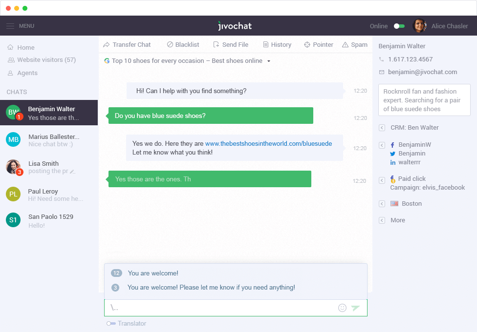 JivoChat offers you a ton of cool feature for your website. They are simple to use, but they help to make your team even more productive. These tools include typing insight, detailed visitor info, CRM integration, real-time visitor monitor, service quality ratings, file transfer, offline lead generator, spell checker and many others. These features make sure that your chats are perfectly timed, and you also get to monitor the visitors to your site. Instant web calls is another feature with JivoChat that help you communicate via a web call if the customer finds it better. With Olark, one of the best features they offer is visitor monitoring. It helps you know who your most frequent visitor is and what they might want. You can even see what is in their shopping cart. This makes it easier for you to suggest other items that could go with the items the visitor has chosen.